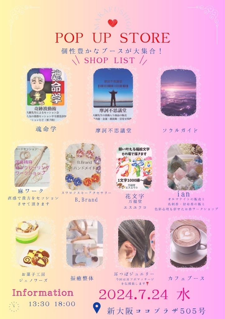 魂命学ブースでの大樹先生の鑑定はもちろん、摩訶不思議堂グッズの販売やカフェコーナー 麻ワーク・スワロフスキーアクセサリー販売・花文字体験・オルゴナイト販売 お菓子販売・整体・耳つぼジュエリーなど 多数のブースをご用意しております